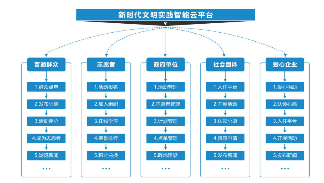 基于新時(shí)代文明實(shí)踐中心的建設(shè)需求,融合宣傳、學(xué)習(xí)、活動(dòng)、志愿者服務(wù)于一體,為“群眾點(diǎn)單、中心(所、站)制單、層層派單”提供全流程技術(shù)支撐服務(wù),致力于打造集宣傳展示、互動(dòng)互通、管理調(diào)度于一體的新型信息化互聯(lián)網(wǎng) + 新時(shí)代文明實(shí)踐中心。